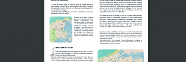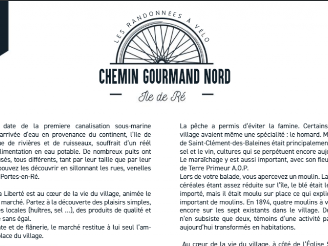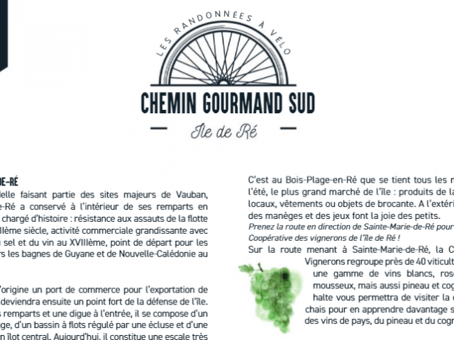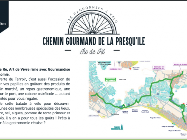 The 3 circuits:Gourmet path of the Presqu'IleChemin gourmand SUDChemin gourmand NORDFind here a lot of other ideas of itineraries by foot, by bike, by stroller :)Map, itineraries, cycle paths on the Ile de RéTracks, distances, travel times...🚲Read more