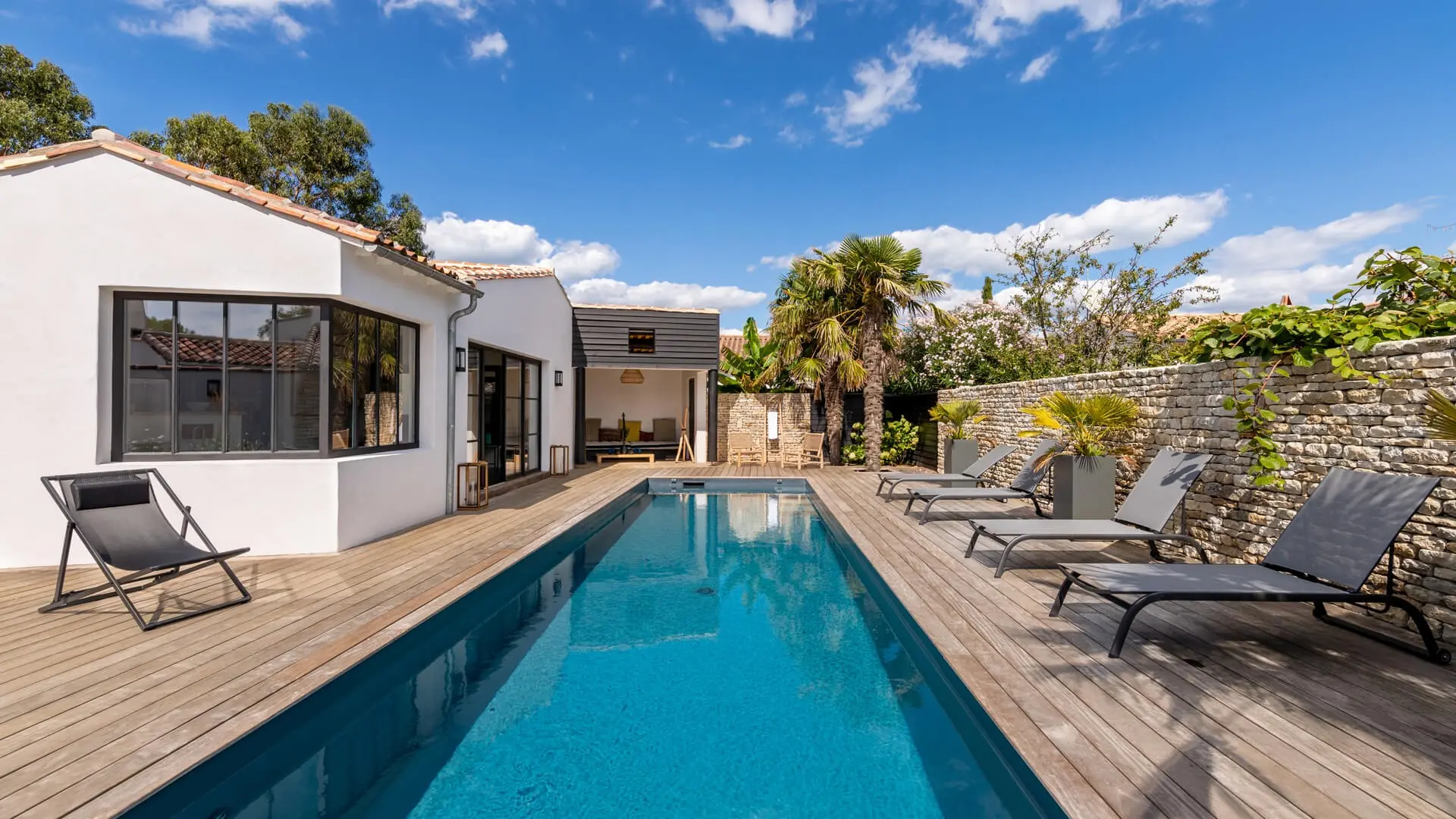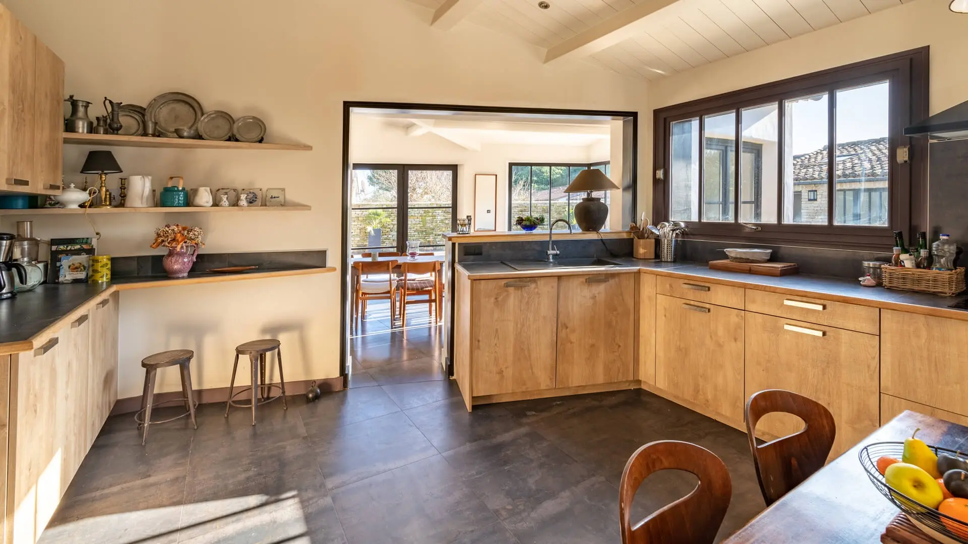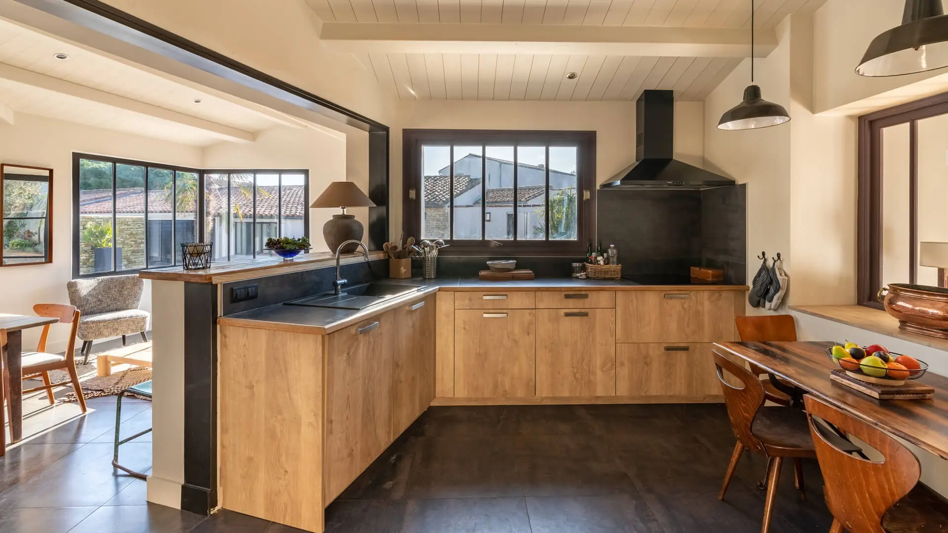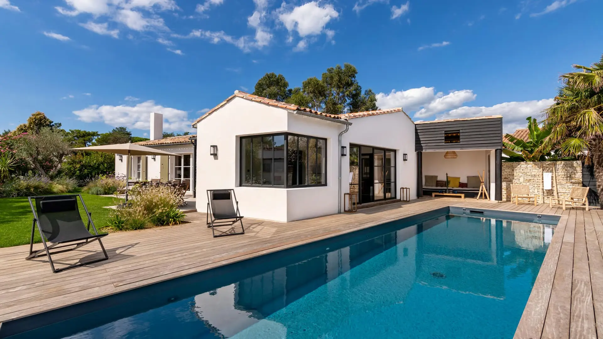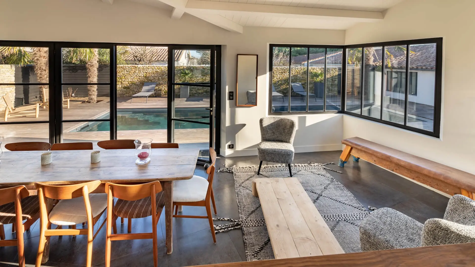 La Villa Phénix ofrece 260 m² de generoso espacio interior, decorado en tonos claros y oscuros para crear un ambiente elegante y muy relajado, a imagen de la isla de Ré.