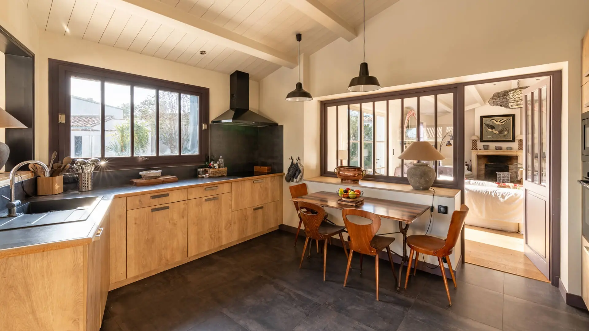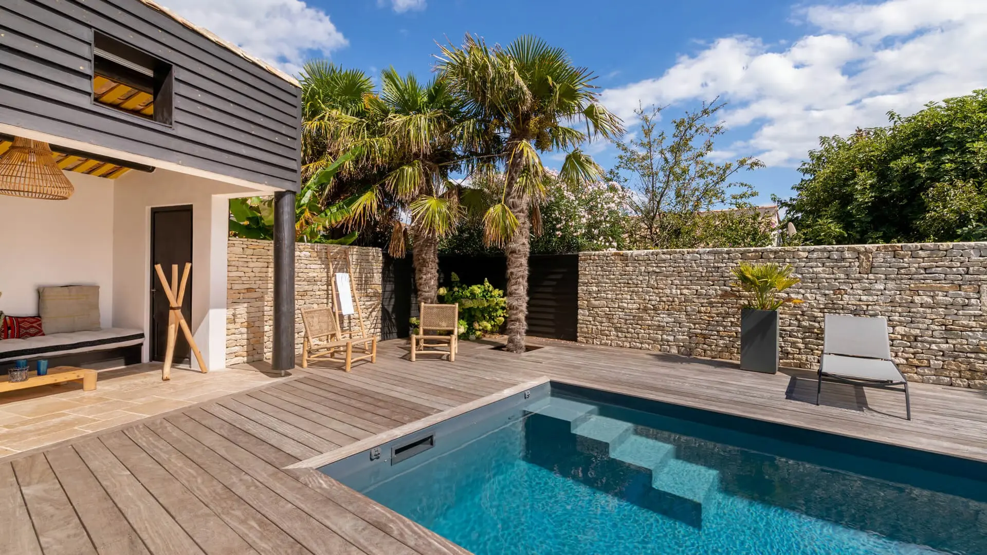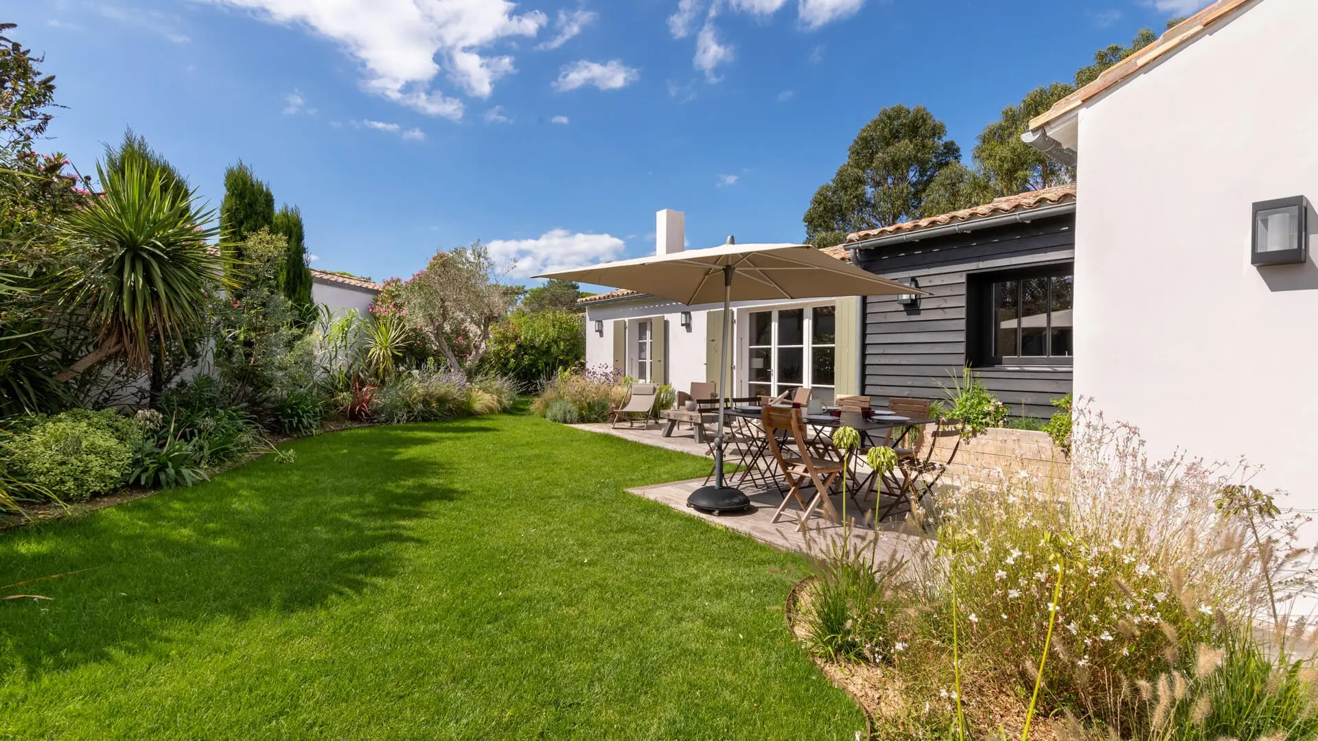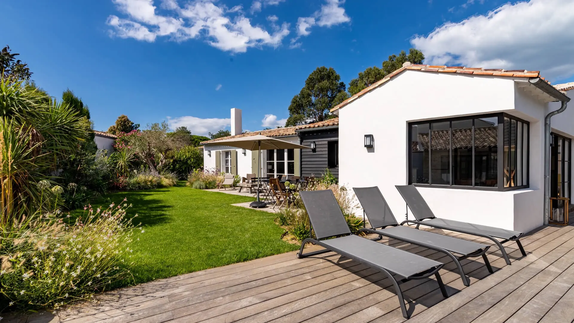 La Villa Phénix ofrece 260 m² de generoso espacio interior, decorado en tonos claros y oscuros para crear un ambiente elegante y muy relajado, a imagen de la isla de Ré.