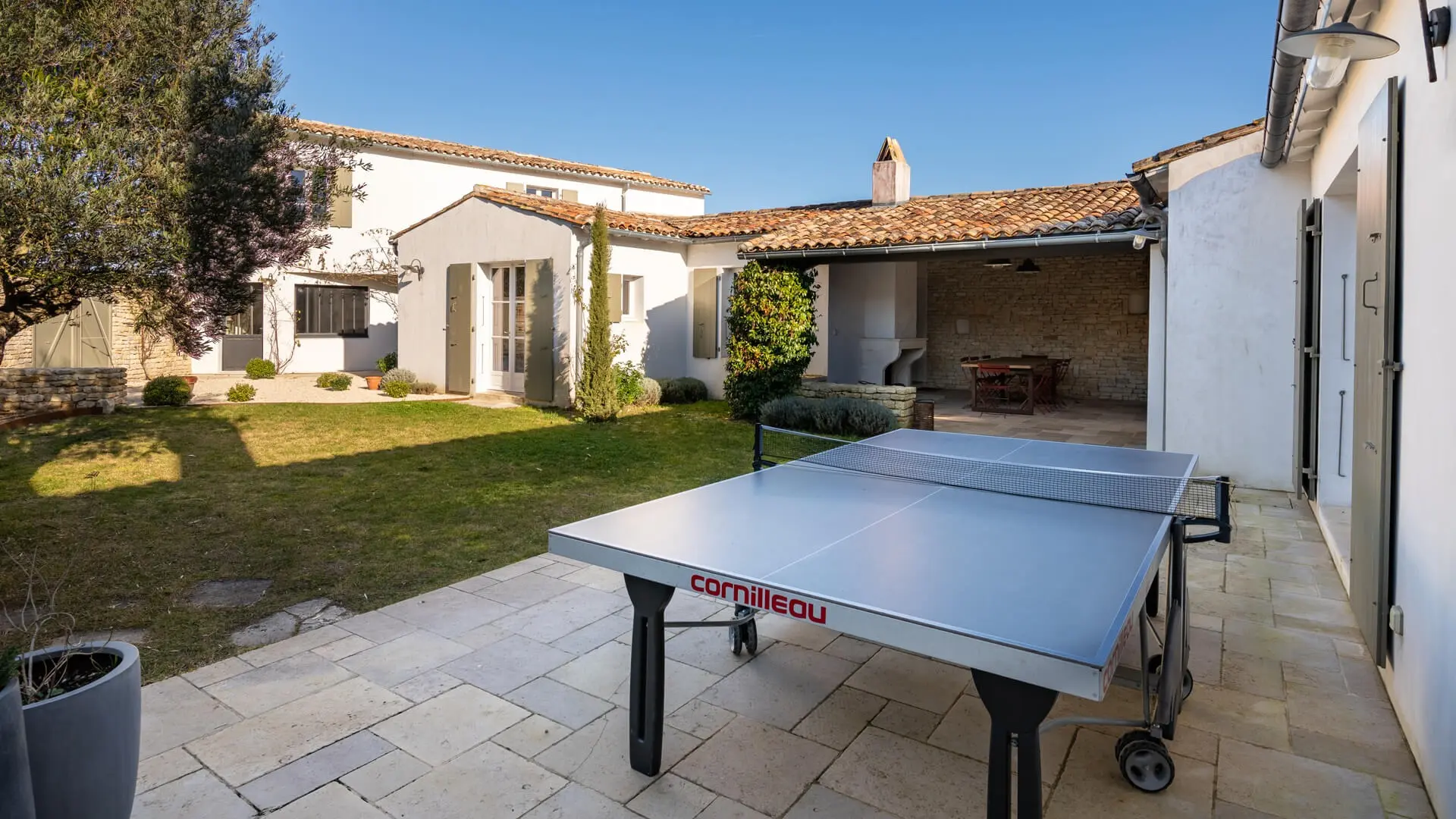 El espacio exterior, completamente remodelado, es una agradable sorpresa, con una piscina climatizada de 11x3 con una cubierta rígida para mayor tranquilidad y un pequeño patio para protegerse del calor del día. Estos dos espacios exteriores permiten a todos disfrutar de momentos de relax, uno alrededor de la piscina y otro junto a las habitaciones, donde podrá practicar su revés en una partida de ping-pong. Bajo el porche, el comedor de verano será el lugar ideal para las comidas en familia.