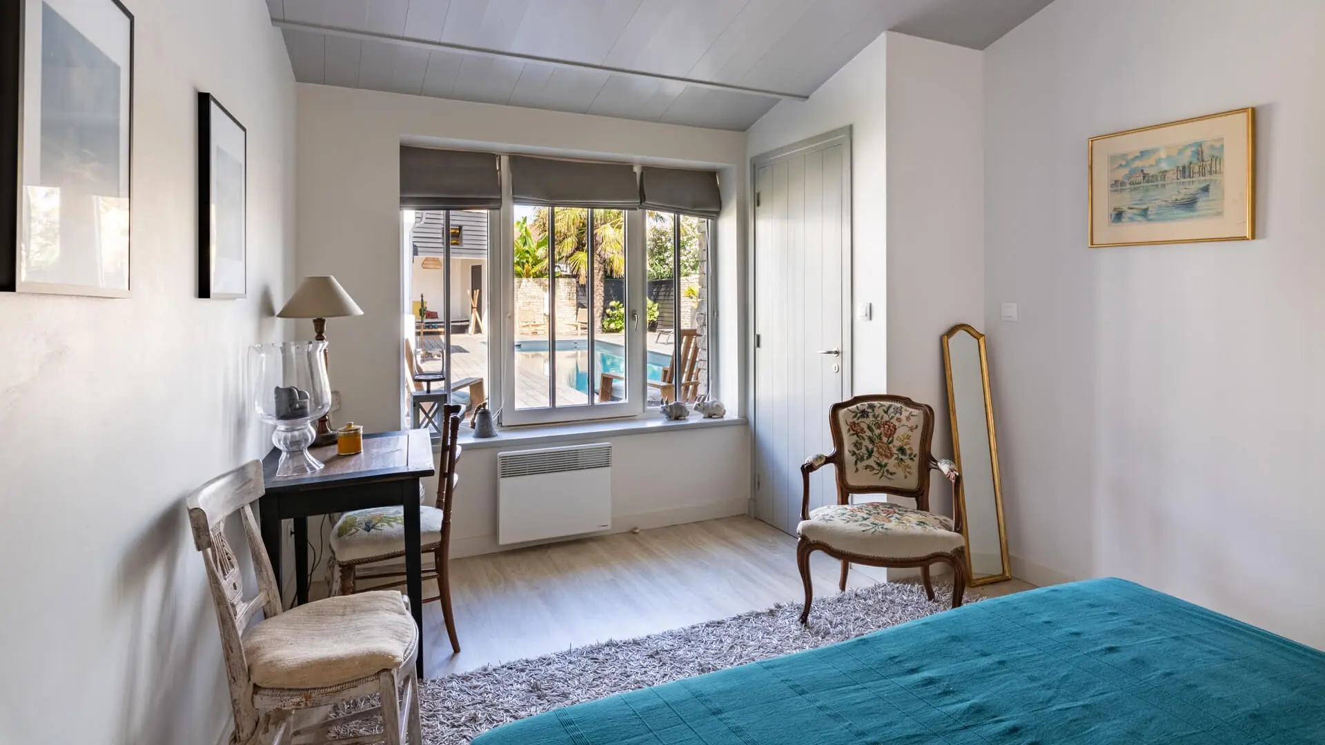 - Habitación 6 - Habitación de invitados (Anexo 2): Habitación, nivel piscina, en otro edificio. La habitación cuenta con 1 cama doble de 180 cm convertible en dos camas individuales. Baño compartido fuera de la habitación.