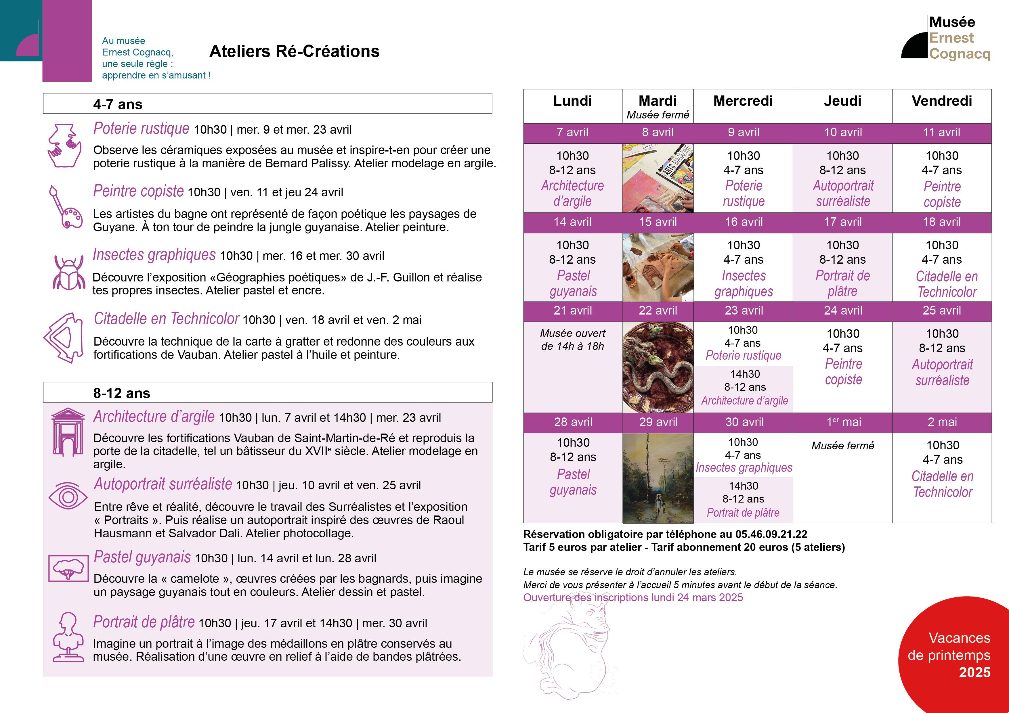 Durant toutes les vacances scolaires, le musée organise des ateliers "Ré-Créations" à destination des enfants de 4 à 7 ans et de 8 à 12 ans.