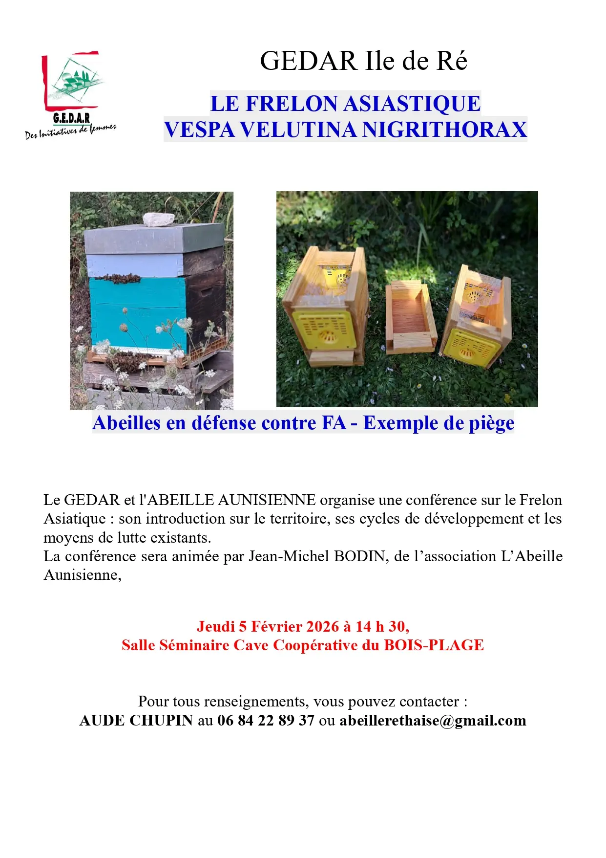 Le GEDAR et l'ABEILLE AUNISIENNE organise une conférence sur le Frelon Asiatique : son introduction sur le territoire, ses cycles de développement et les moyens de lutte existants.