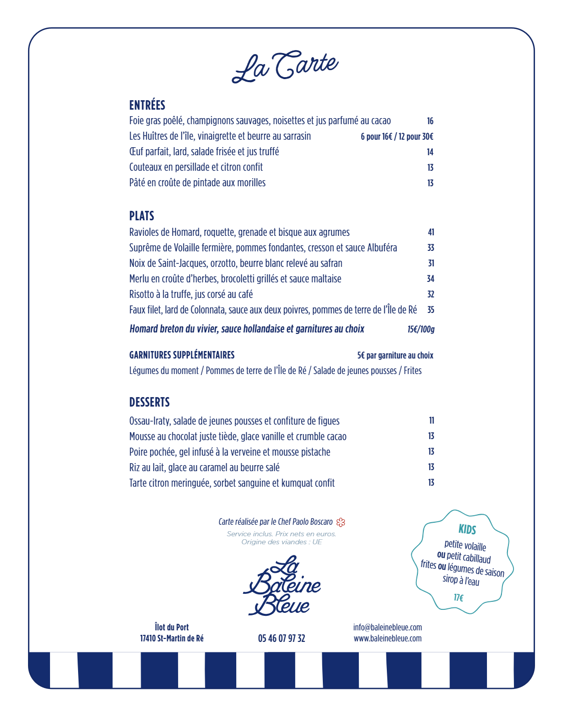 Dotée de nombreuses terrasses, La Baleine Bleue vous propose tout au long de l’année une vue panoramique sur le port de Saint Martin de Ré.