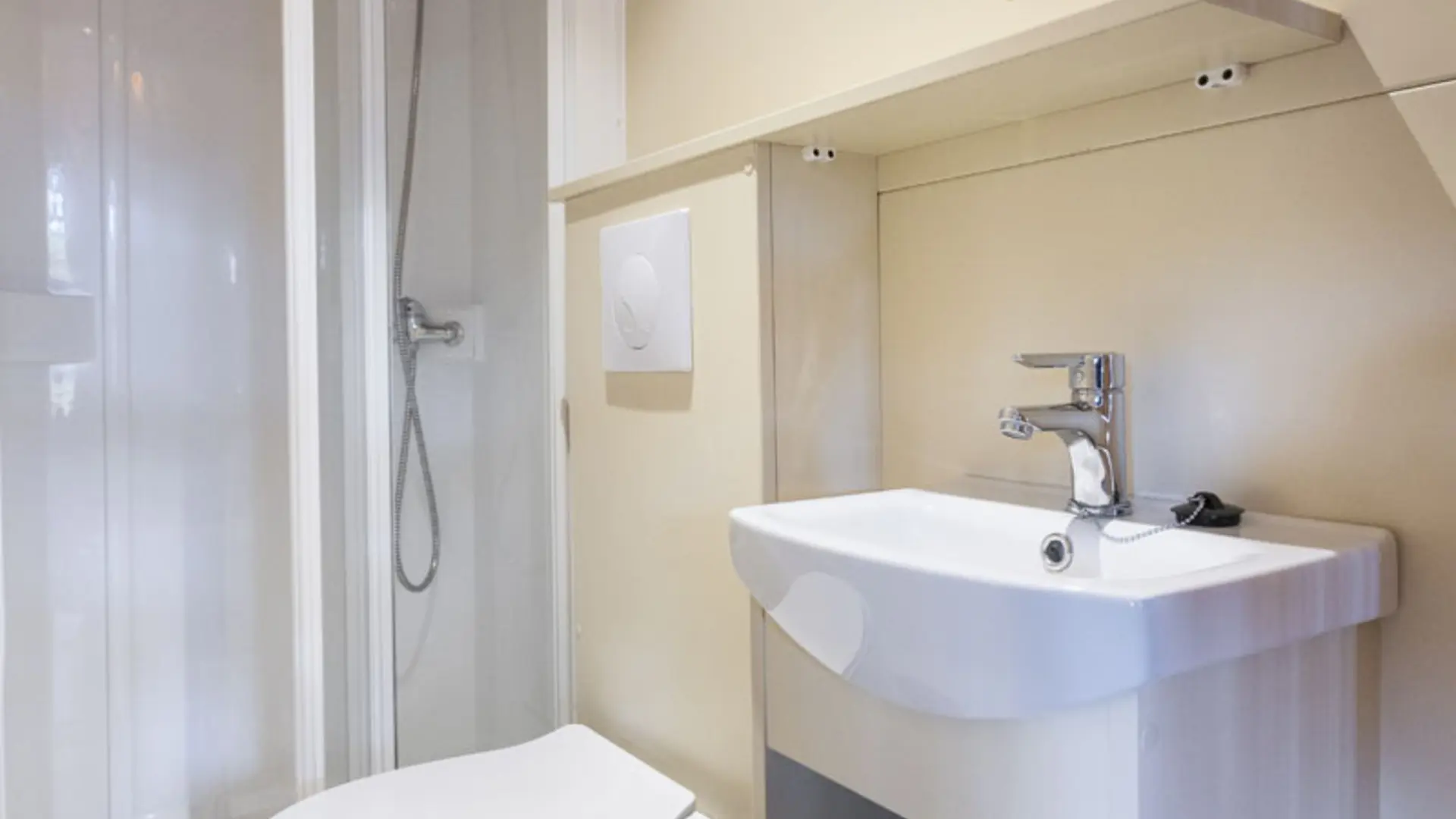Un espace salle de bain avec douche, lavabo, et toilette.