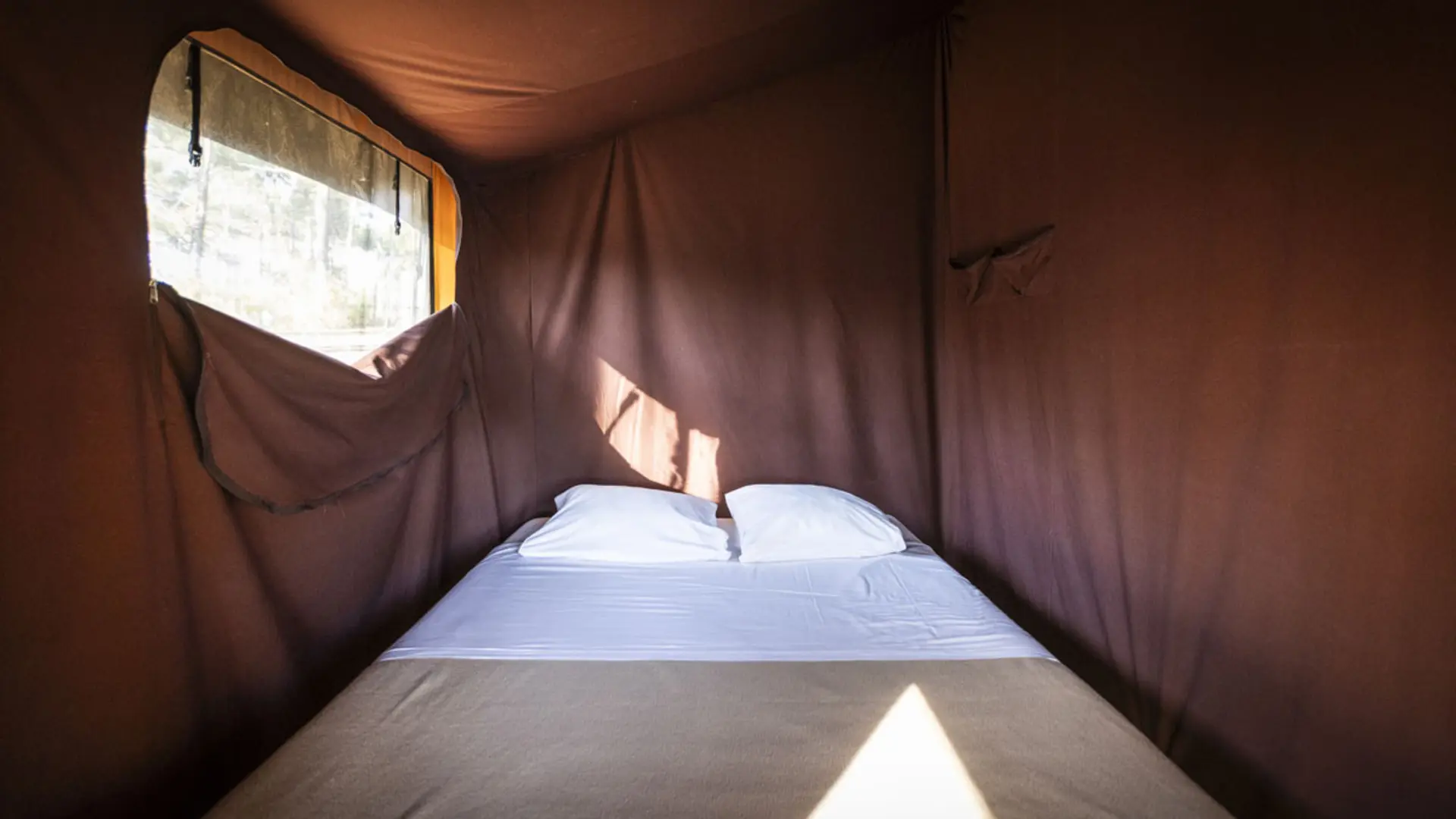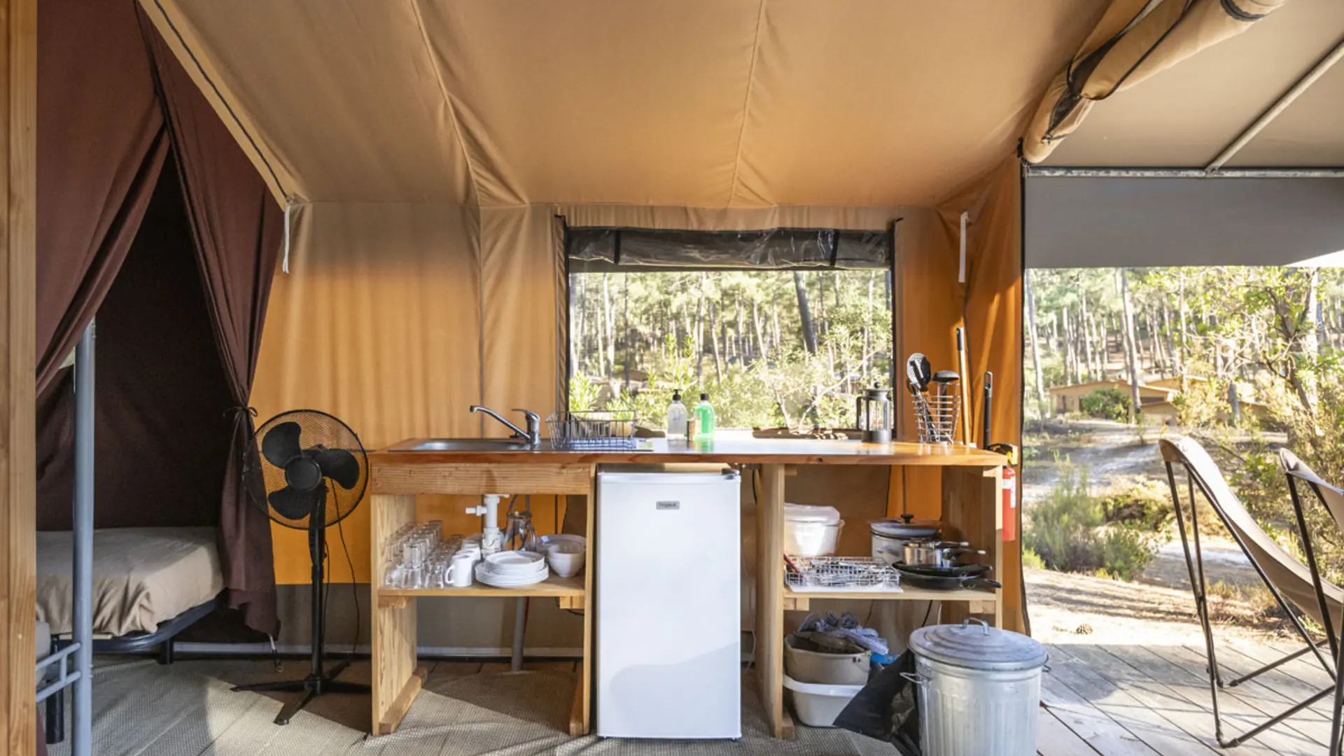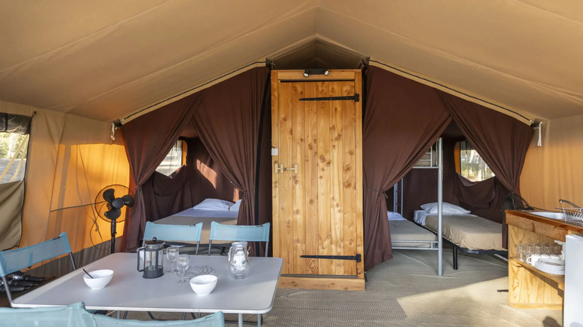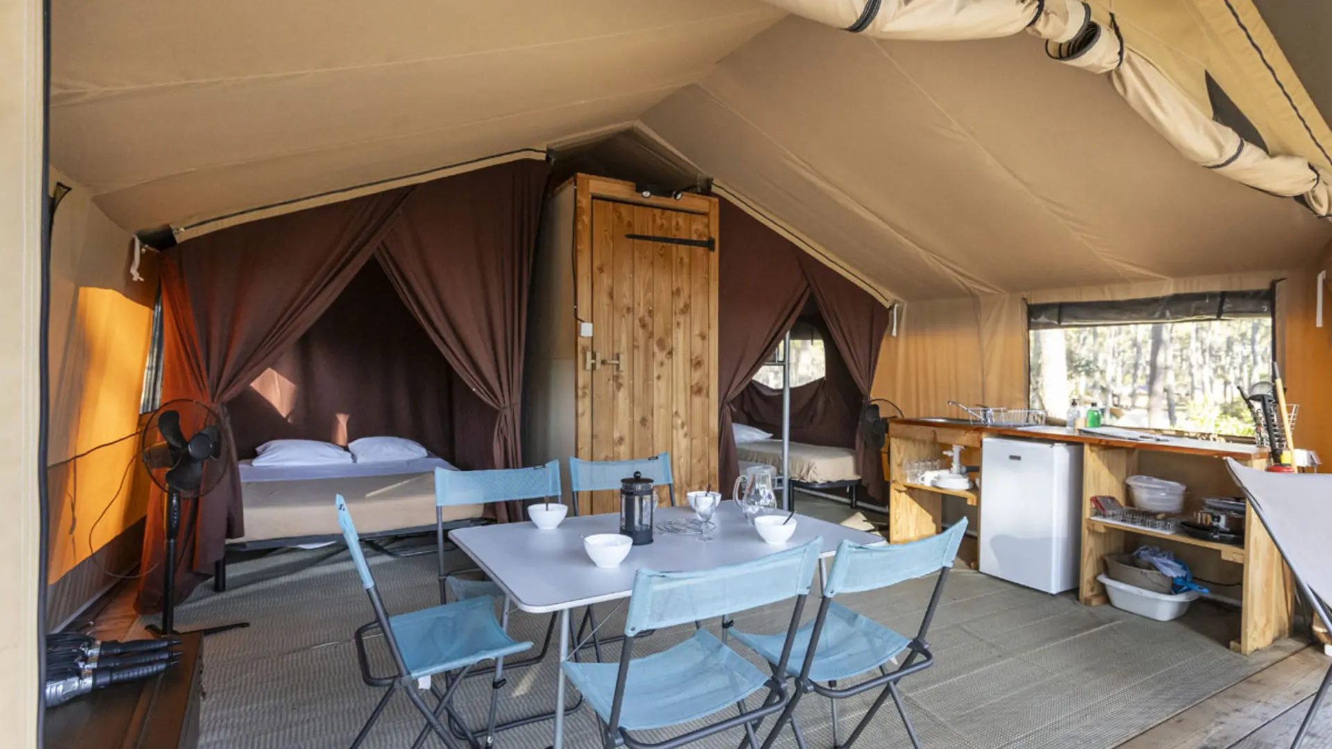 Une tente pour 5 personnes avec le luxe d’une salle de bain privative et d’un coin cuisine équipé pour une expérience unique sous la toile.