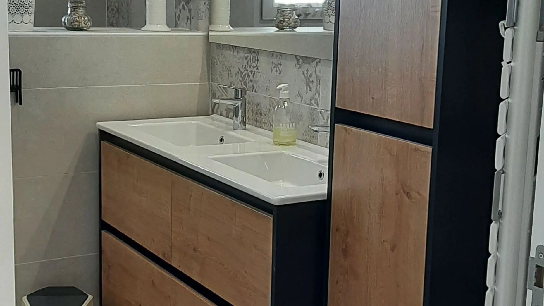 La salle de séjour s'ouvre sur une grande terrasse orientée au Sud et ombragée par deux stores-bannes.