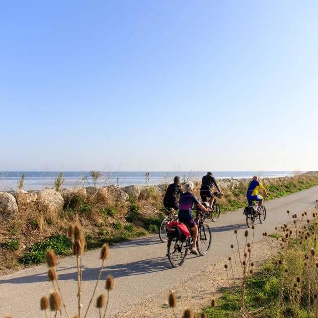 Cette image montre un groupe de cyclistes parcourant une piste cyclable le long de la côte à La Couarde, sur l'île de Ré. Le chemin est bordé de végétation naturelle et offre une vue imprenable sur la mer. Le ciel est dégagé, offrant des conditions idéales pour une balade à vélo en pleine nature, en harmonie avec le paysage côtier.
